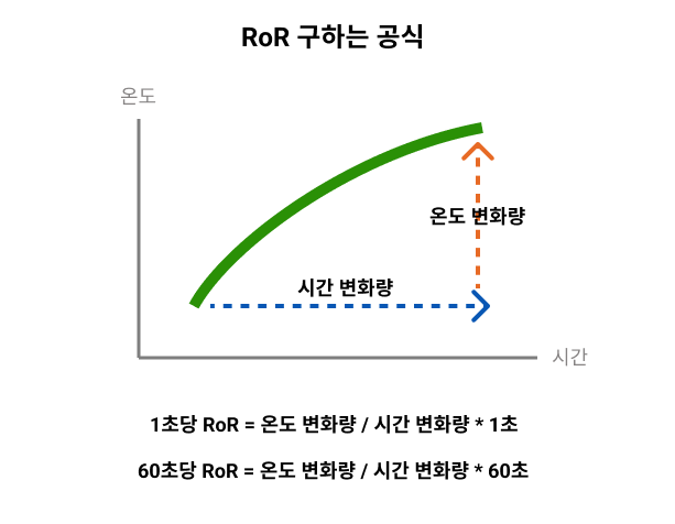 RoR 값을 구하는 공식은 온도 증가량 / 시간 증가량 * 단위 시간 입니다.